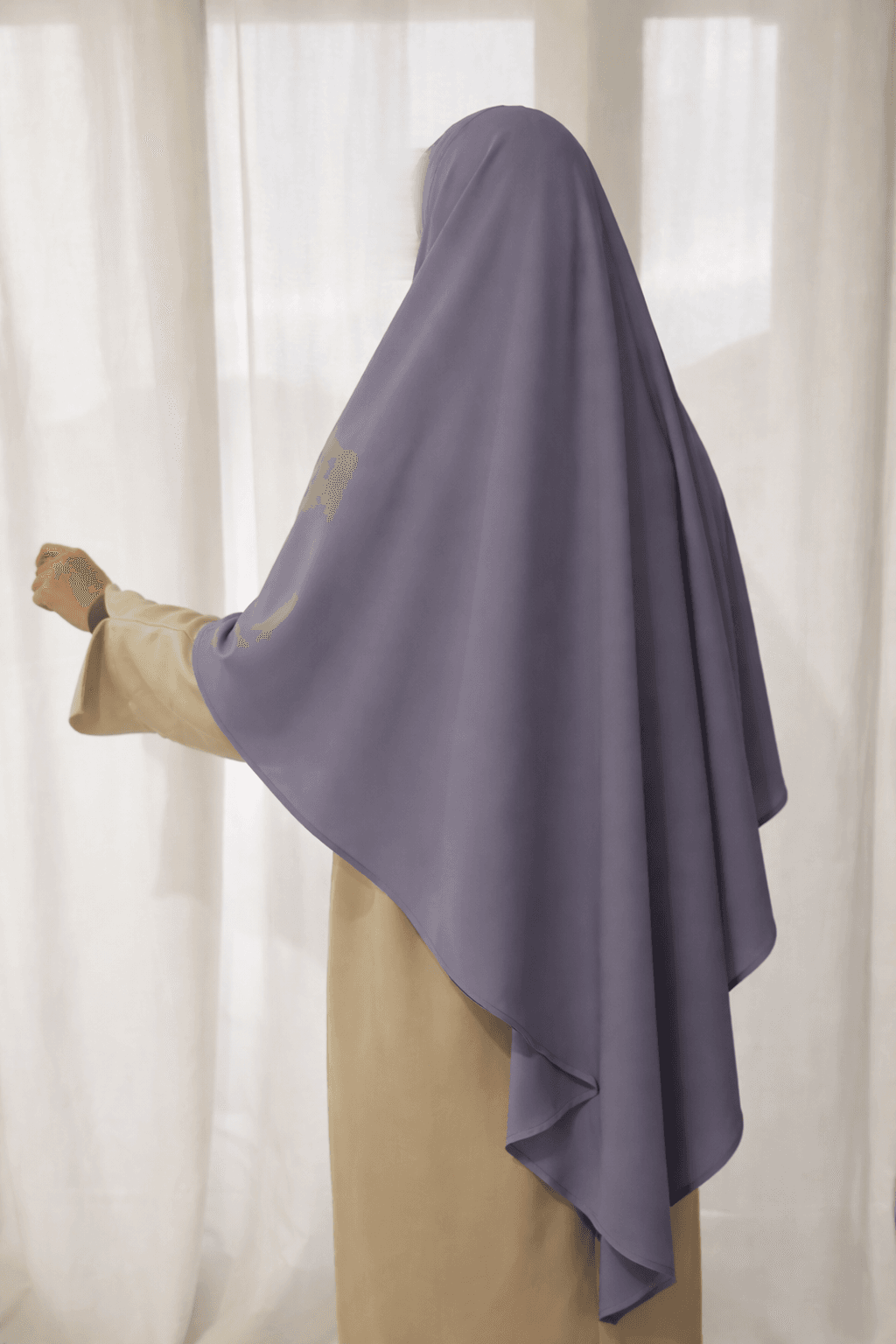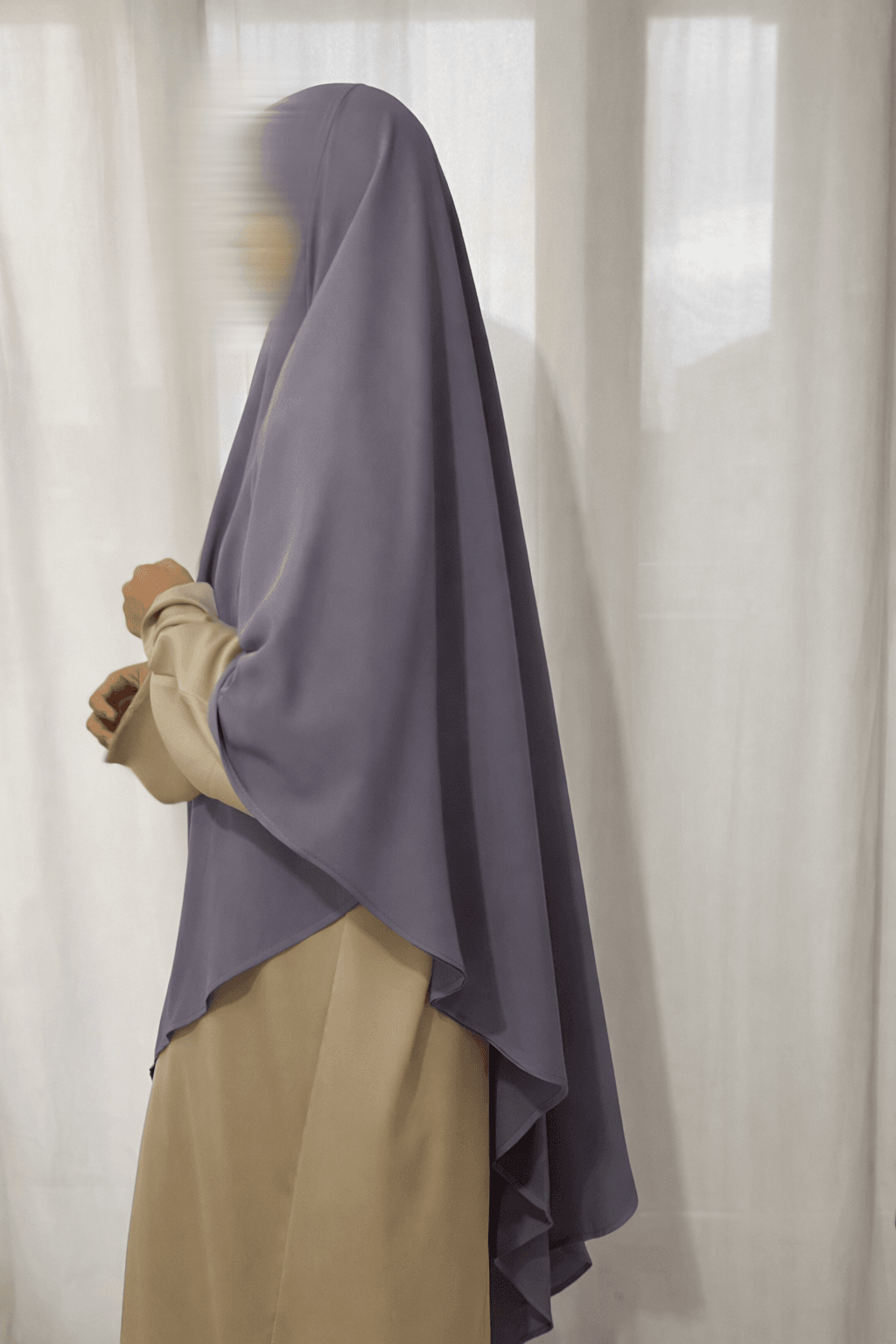 Khimar en soie de Médine, élégant et raffiné, doté d’un magnifique retombé grâce à sa matière fluide et haut de gamme.